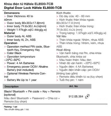 Màu đen, kết nối bluetooth, khóa/ mở khóa Mã PIN, chìa cơ , Remote ( tùy chọn). Giá bao gồm VAT, chưa tính phí lắp đặt.